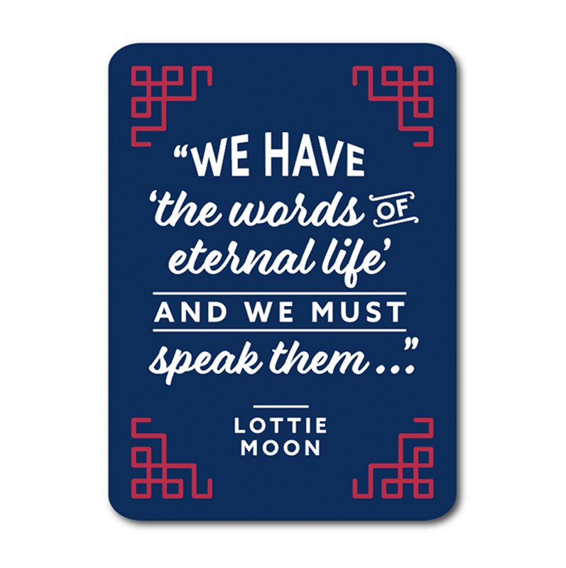 Affix this free sticker to your water bottle, favorite journal, laptop, or luggage as a reminder (and a great conversation starter) of these important words from Lottie Moon, written to the mission board president on November 11, 1878: “We have ‘the words of eternal life,’ and we must speak them …”